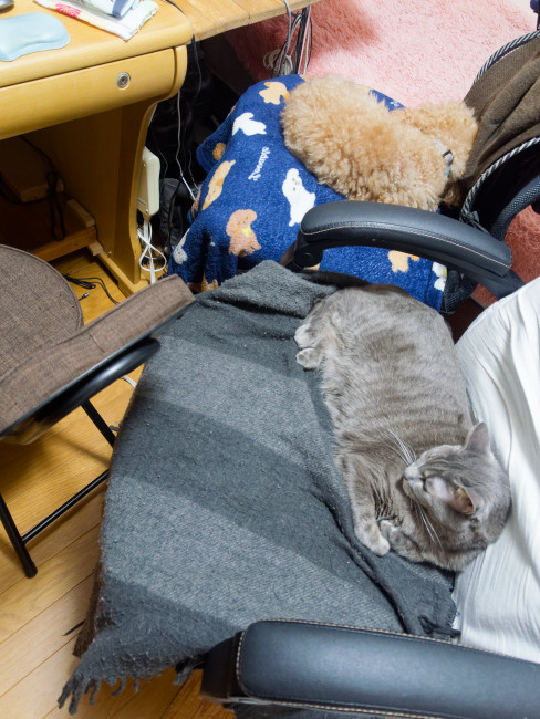 グレーの布は電気膝掛けで席を立つ時に置くのですが「ぬくぬくで最高😸」と、乗ったが最後ガンとして退きません。