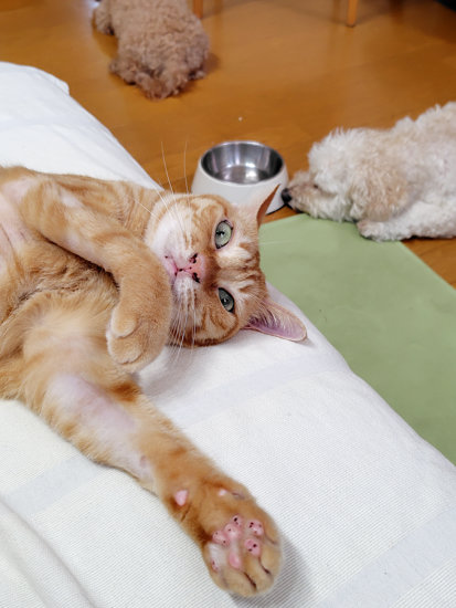 床で体をくねらせていたり、クッションの上でゴロゴロしているときは、リラックスしていることが伺えます。