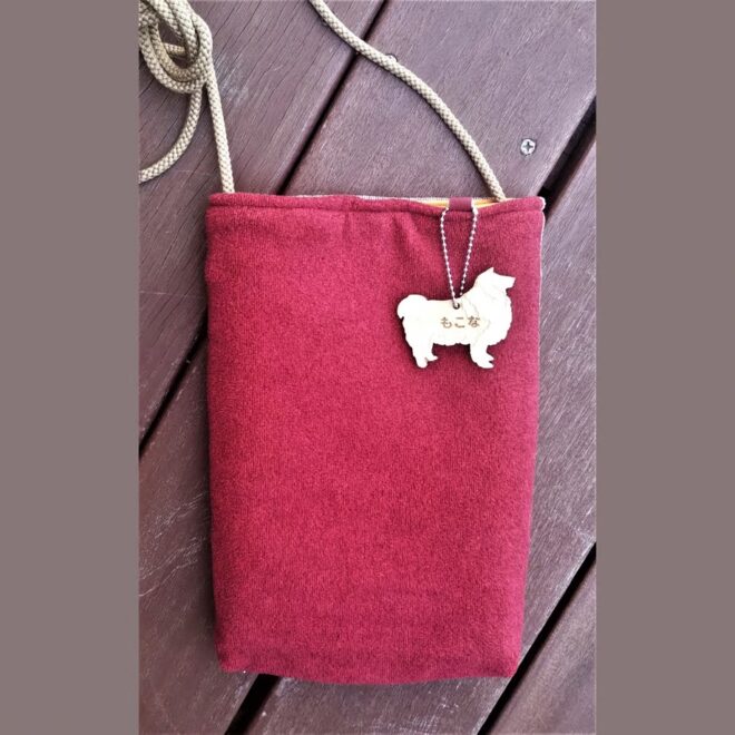 スマホが入るフリース素材のショルダー モンベルフリース端材のショルダー・レッド(名入れ木製チャームつき)