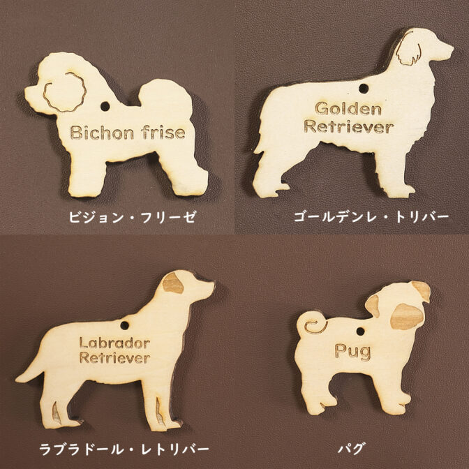 ワンちゃんのシルエットに名前を彫刻した木製チャームです。