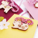 福いぬ・福ねこの木札はレーザーカッターで彫刻し、木札は願いが叶うと言われる「二重叶結び(お守り結び)」で結んでいます。