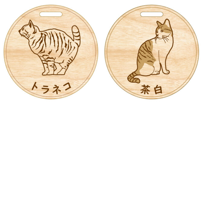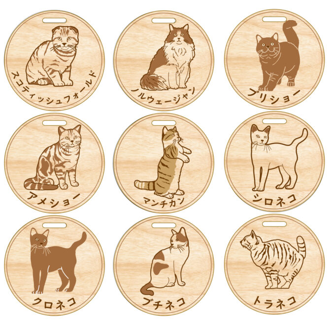 ・木製チャームは9種の猫種から選べ、愛猫の名前を刻印できます。